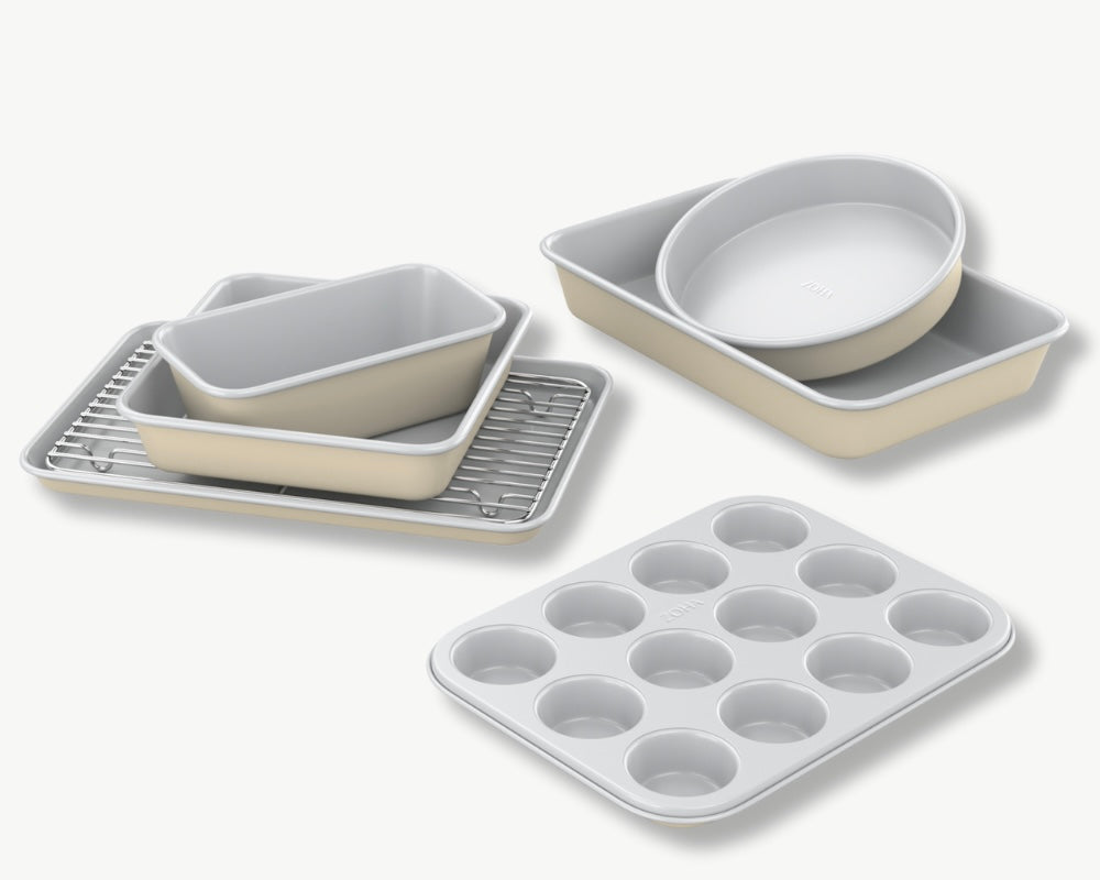 Das 6-teilige Backset vereint alles, was du zum Backen brauchst – von Muffinform über rechteckige und runde Backformen bis hin zum praktischen Auskühlgitter. Jedes Teil ist mit einer hochwertigen Antihaft-Keramikbeschichtung versehen, die Backpapier überflüssig macht und dir eine einfache Reinigung ermöglicht – ganz ohne Verkleben und mit deutlich weniger Fett.